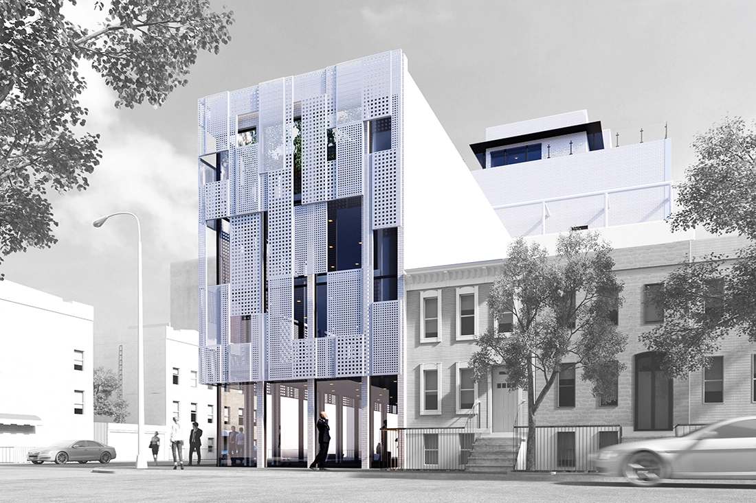 Our solution was a perforated metal facade that solves multiple problems simultaneously. The screen provides privacy for residents while allowing full-height glass behind it, delivering unobstructed New York City views. The perforated metal also functions as passive solar shading, reducing cooling loads and supporting our goal of passive building certification. The metallic facade contrasts with the neighborhood’s white brick residential buildings, giving the development market differentiation.