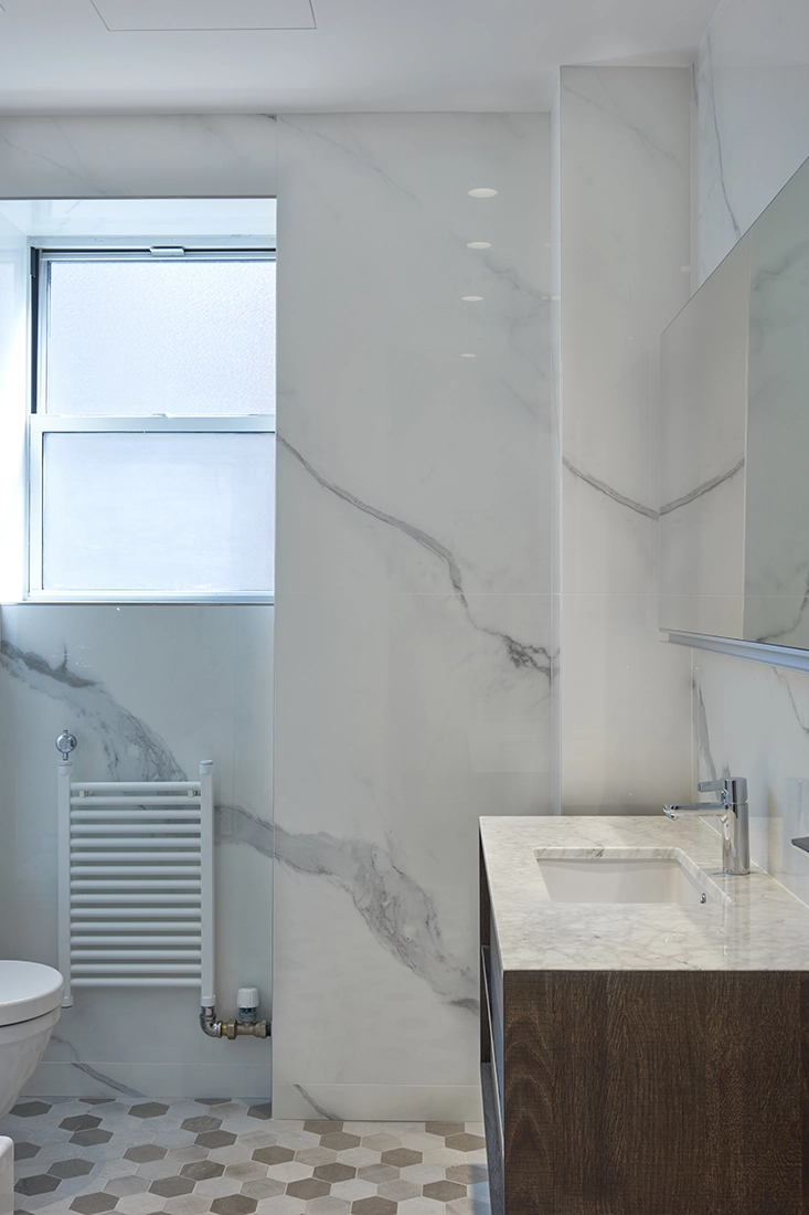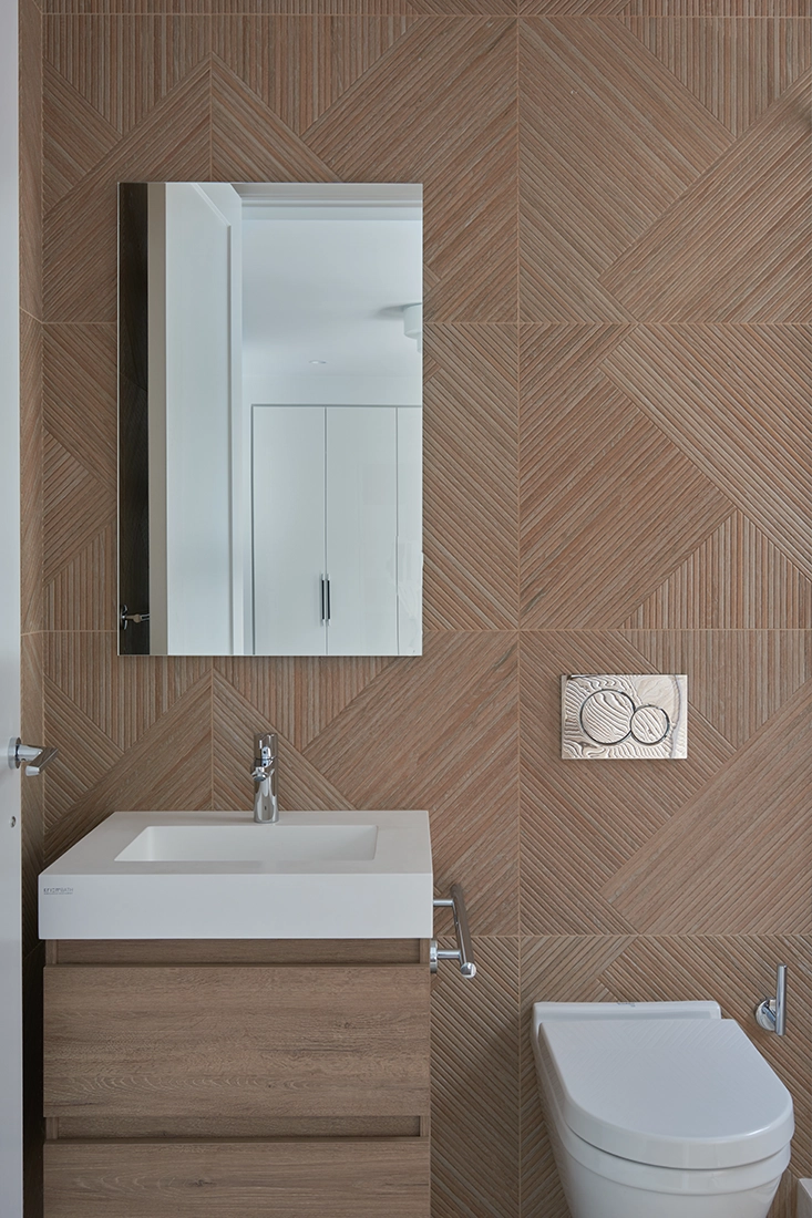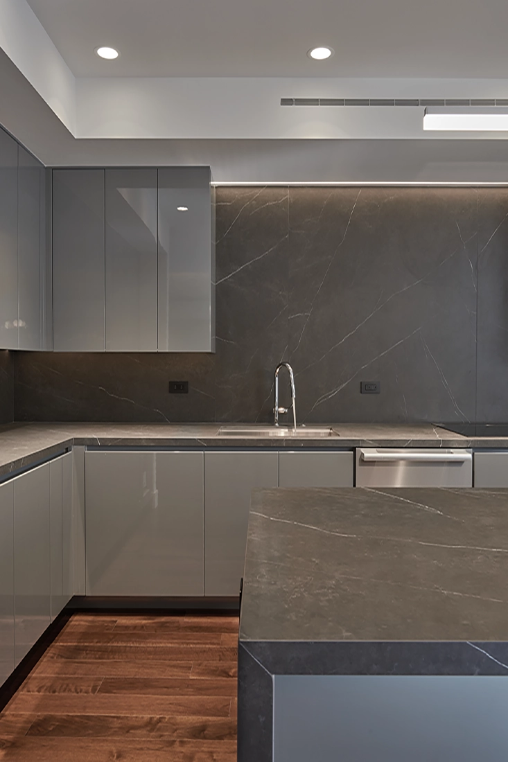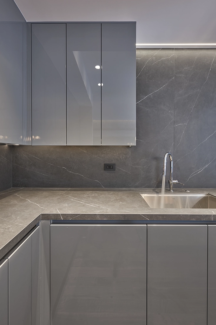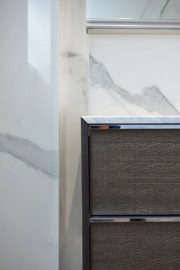 In this project, however, a new protagonist emerged: a continuous stone and millwork wall extending from the living room through the dining area and into the kitchen. This architectural thread unified the main spaces, giving them a shared identity while reinforcing the logic of the overall layout.